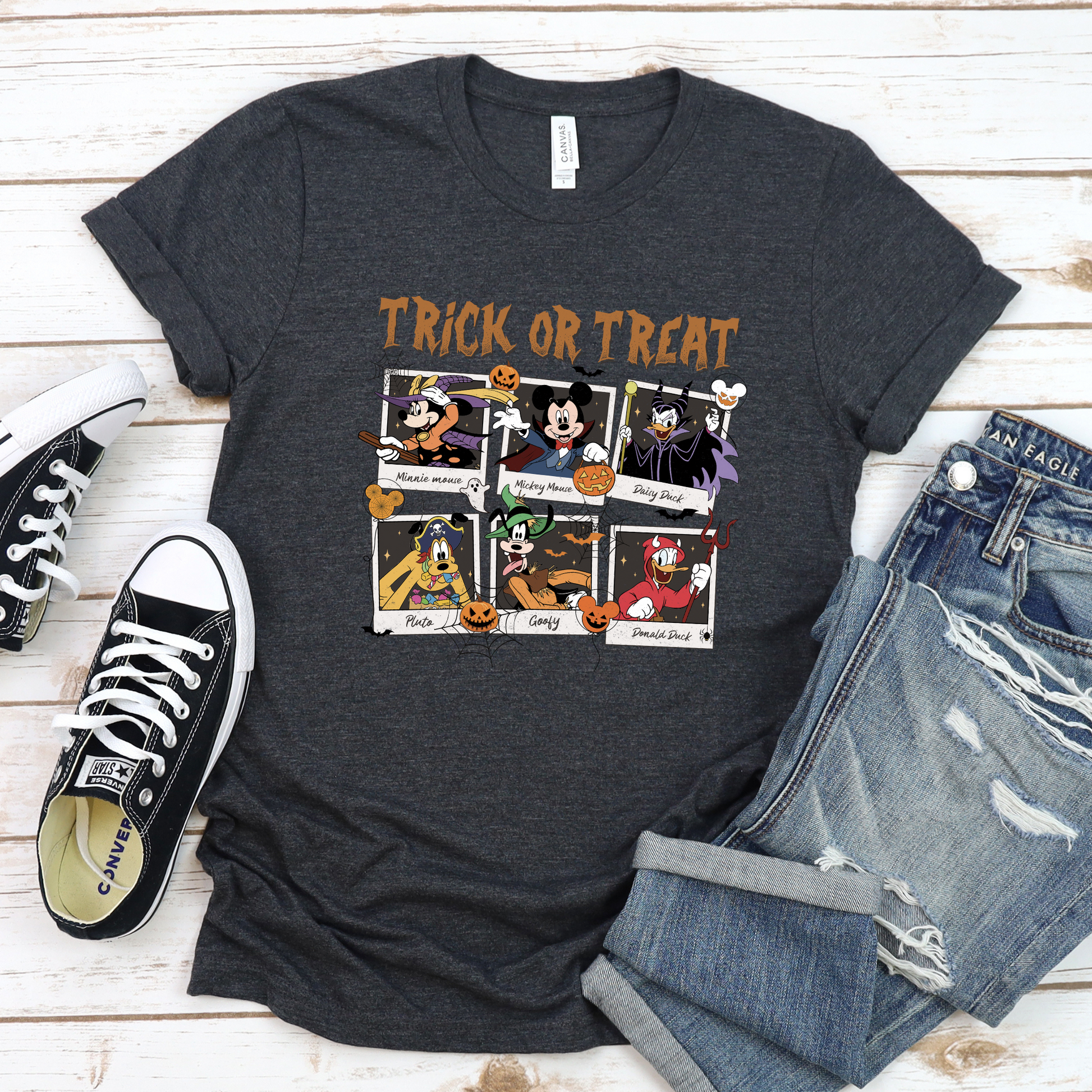The Mickey and Friends Trick or Treat Adult T-Shirt is a fun and festive piece of clothing perfect for Halloween festivities. The shirt features beloved Disney characters such as Mickey Mouse, Minnie Mouse, Donald Duck, and Goofy dressed in spooky costumes and ready for some trick or treating fun.