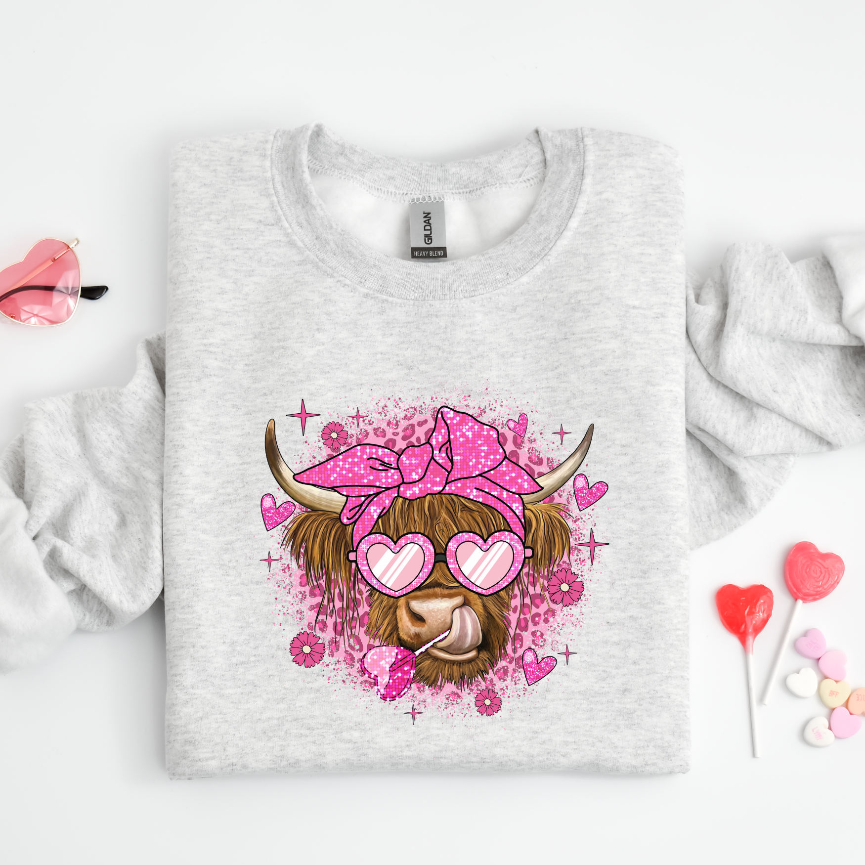 With a Valentine's Day twist, these sweaters feature a Highland cow with heart-shaped sunglasses and a heart shaped lollipop. Whether you're looking for a gift for a loved one or just want to treat yourself, this sweater is sure to bring a smile to anyone's face.