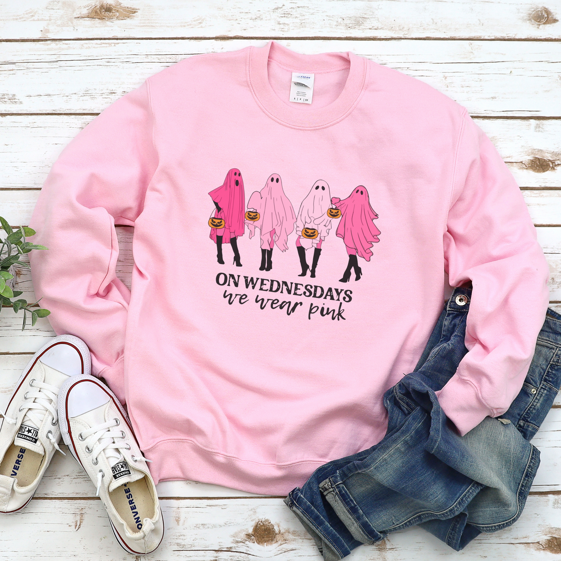 This Mean Girls inspired "On Wednesdays We Wear Pink" Ghost Crewneck Sweater is super soft and cozy and comes in sizes Small - 3XL.